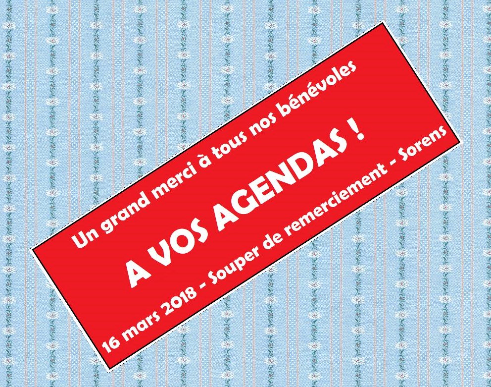 Grâce à l'aide précieuse de vous tous, bénévoles, la fête fût belle. Afin de vous remercier, nous vous invitons à partager un repas et à passer une soirée conviviale en compagnie des membres de l'Echo du Gibloux, le vendredi 16 mars 2018 à la halle poylvalente de Sorens. Une invitation personnelle suivra.